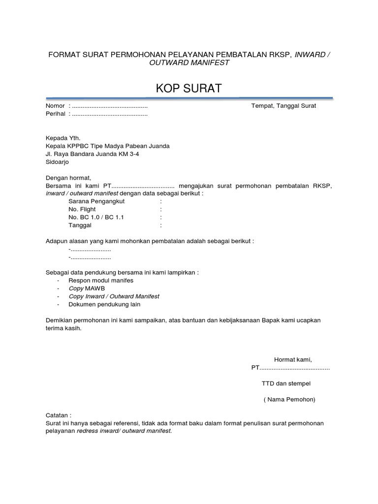 Format Surat Permohonan Pelayanan Pembatalan Rksp Inward Outward Manifest Pdf